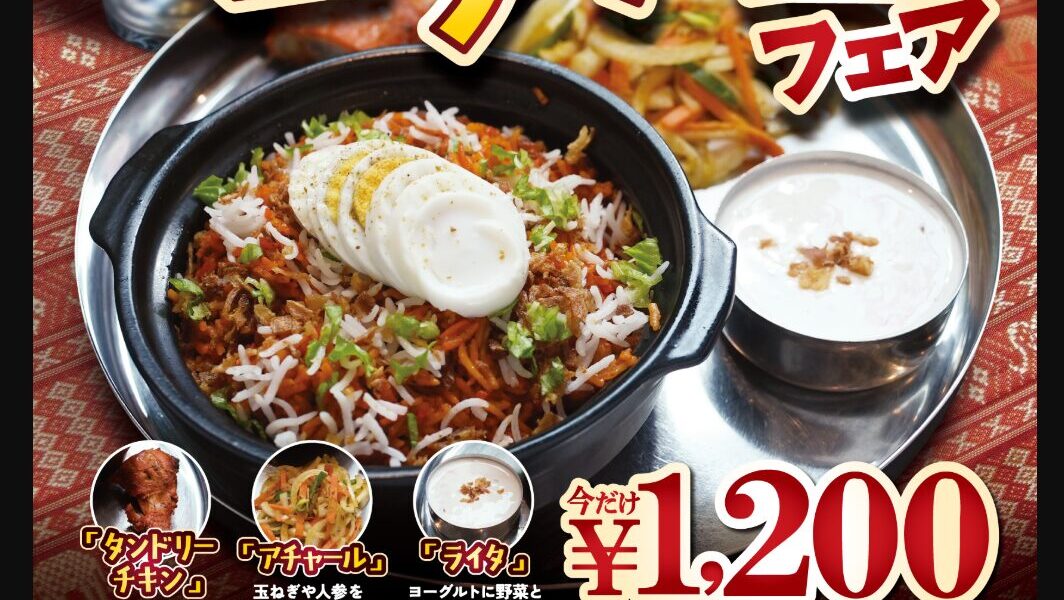 Enjoy a limited-time Biryani Fair at Kum Kum (7th floor), featuring authentic Indian biryani made with premium basmati rice, known for its rich aroma and light texture. Chicken, mutton, and vegetable biryani are all available at a special price of ¥1,200 during the fair. Each biryani set also includes special side dishes not usually on the regular menu: half-size tandoori chicken, achar (Indian pickles), and raita (yogurt sauce). A perfect chance to experience flavorful Indian spices in a special set menu.